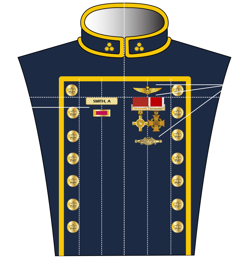 Placement of name badge, ribbons and other insignia.